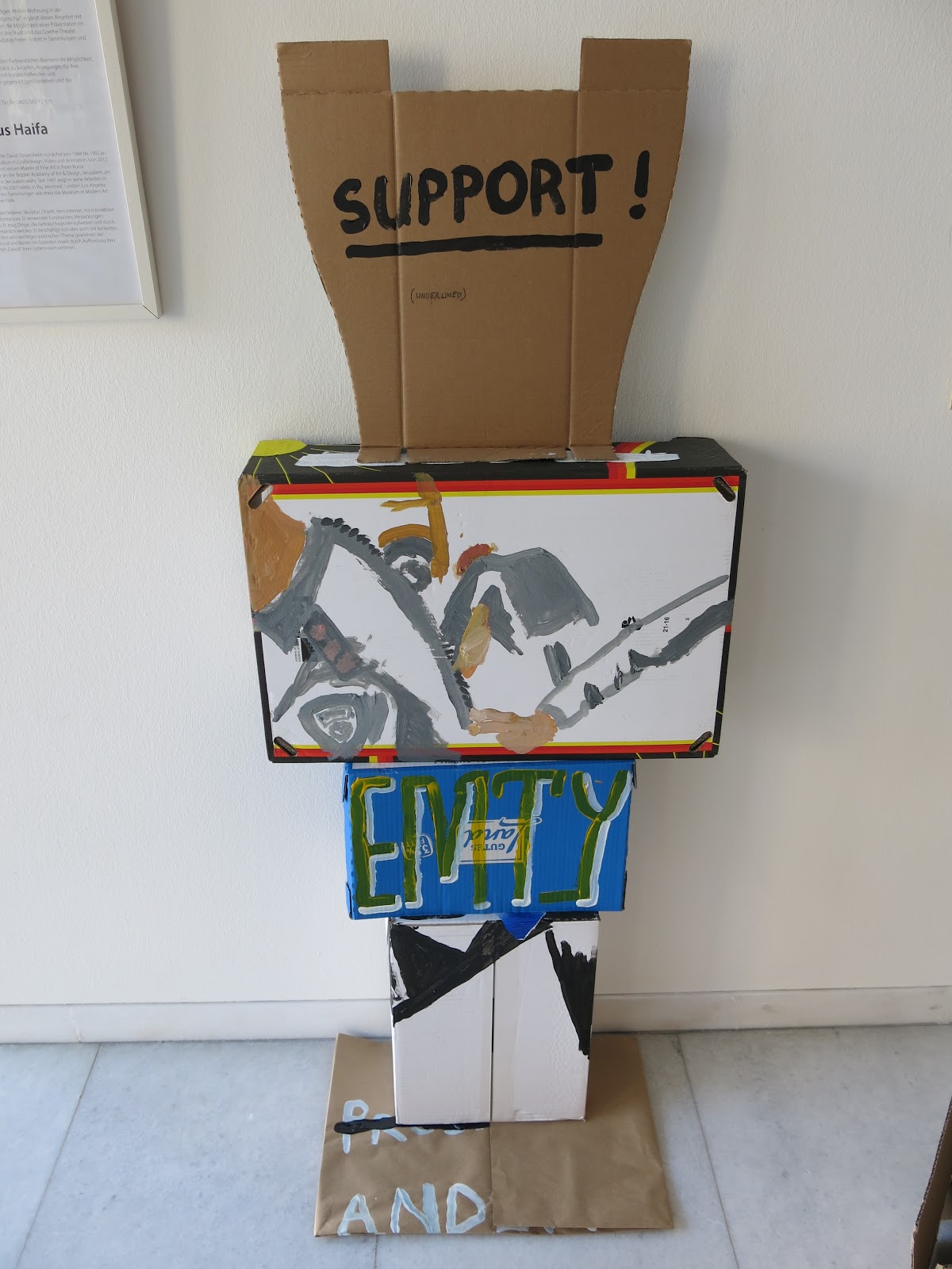 Geboren 1965 in Kalifornien und aufgewachsen in Israel absolvierte David Oppenheim zunächst von 1988 bis 1992 an der Bezalel Akademie für Kunst und Design in Jerusalem sein Studium in Grafikdesign, Video und Animation. Von 2012 bis 2014 studierte er an der Universität von Haifa und machte dort seinen Master of Fine Art in freier Kunst. Anschließend und bis heute nimmt er regelmäßig Lehraufträge an der Bezalel Acadamy of Art & Design, Jerusalem, am Wizo Collage of Art in Haifa und an der Musrara School of Art, in Jerusalem wahr. Seit 1997 zeigt er seine Arbeiten in Ausstellungen in Israel aber auch in New York, in Rio, Montreal, London, Los Angeles u.a. Arbeiten von ihm befinden sich in privaten und öffentlichen Sammlungen wie etwa das Museum of Modern Art San Francisco oder das Museum of the Moving Image, in New York. David Oppenheim ist nicht nur bildender Künstler, sondern auch Musiker. 1996 gründete er die Day-Dream Studios in New York, wo er von 1992 bis 2001 lebte, und produziert und komponiert elektronische Musik für Tanz, Theater, Video und Film. Als bildender Künstler arbeitet er mit und in verschiedenen Medien: Malerei, Skulptur, Objekt, dem Internet, mit interaktiven elektronischen Mitteln in Video und Audio und macht Performances. Er arbeitet mit Fundsachen, mit Verpackungen, mit Werbung und Medien, mit unterschiedlichen Oberflächen. Er mag Dinge, die Gebrauchsspuren aufweisen und durch den Gebrauch eine eigene Geschichte aufweisen und persönlich werden. Seine Bildträger, die oft aus entsorgten Kartons von leeren Verpackungen bestehen, bearbeitet er gerne in Schichten; er übermalt oder collagiert sie mit unterschiedlichen Materialen, Papier, transparenter Folie oder Klebebänder. Durch manchmal minimale Hervorhebungen von vorhandenen Zeichen und Strukturen, lässt er neue Dinge und Assoziationen entstehen. Er lässt sich dabei einmal vom zufällig Vorhandenen – Firmenlogos, Rissen, Notizen, u.a. – inspirieren und verlässt auch einen ursprünglich angedachten Plan, wenn sich während des Arbeitens etwas ganz anders entwickelt. Er beschäftigt sich aber auch mit konkreten Themen. So sind seine auf Kartons geschaffenen Bilder für diese Präsentation einem ihm sehr wichtigen politischen Thema gewidmet: der Vertreibung arabischer Nomaden von ihrem eigenen Grund und Boden im Südosten Israels durch Aufforstung ihrer Gebiete, womit sie durch einen nur vordergründig „guten Zweck“ ihren Lebensraum verlieren. Polizei und Militär vertreiben die Widerstand leistenden Bewohner und Sympathisanten immer wieder durch Zwangsevakuierungen und zerstören die verbliebenen oder wieder neu aufgebauten Häuser und Zelte.