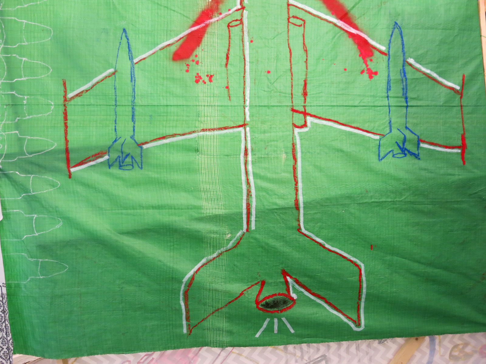 מפת שולחן חד פעמית, שנמכרת לפי מטר רץ עם הכיתוב – “לכבוד שבת ויום טוב”, משמשת מצע לציור של תת מקלע עוזי, גאוות התעשייה הצבאית הישראלית, המנוכס לסמל יחידה פלסטינית מדומיינת. הדימויים המרכיבים את העבודה הם בצבעי פלסטין וחיזבאללה. נרות השבת הגבוהים, מתגלים במבט שני כקליעים זקורים, פאליים. כלי זין. קדושת השבת, קדושת המלחמה ואתוס הלוחם הגברי המאצ’ואיסטי מתערבבים זה בזה בחומר הזול של חיינו.
